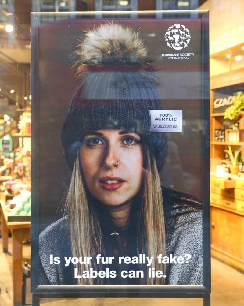 Both the fur-trimmed hat and the fox are shown sporting the same ‘100% acrylic’ label attached to their fur to show that labels can lie.