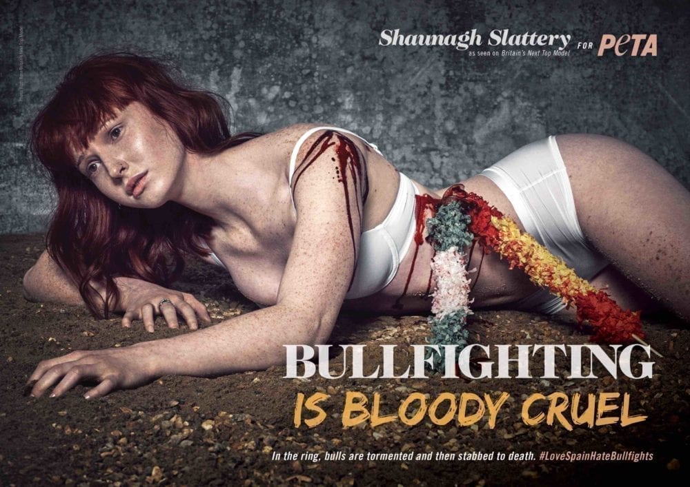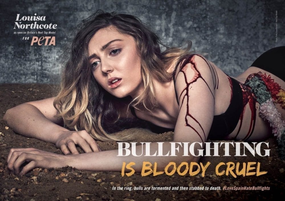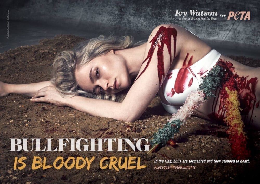 As part of a collaboration with PETA, the models posed with realistic skinned ‘animals’ for ads reading ‘Here’s the Rest of Your Fur Coat’. In other shots, models took the place of tigers beaten into performing circus tricks and bulls tormented and stabbed to death in bullfighting rings.