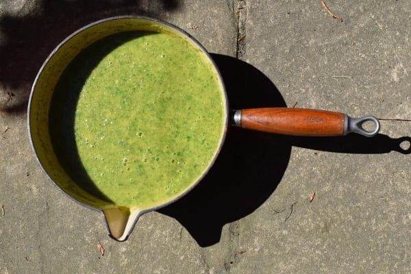 Add washed nettle tops (you can also add other foraged greens such as a few dandelion leaves and a handful of wild garlic leaves or hedge garlic), 750ml of boiled water (you can add some stock to this water if you like, I don’t) and a squeeze or lemon and/or a little apple cider vinegar. Blanching deactivates the sting of the nettles.