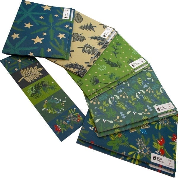 Beautiful gift wrap made from 100% recycled post-consumer waste unbleached pulp, and printed with environmentally friendly vegetable-based inks.
