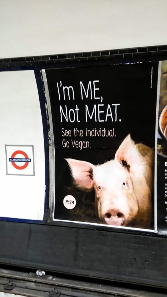 Clapham Common tube station is now fully plastered with more than 60 ads featuring cows, pigs and chickens. They appear on every poster, door and turnstile, telling commuters, ‘I’m ME, Not MEAT. See the Individual – Go Vegan’.