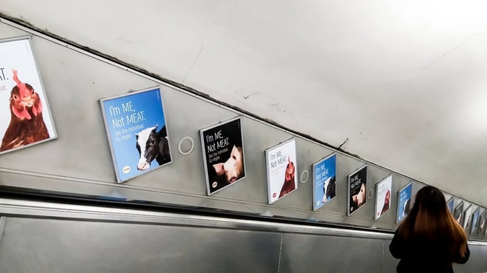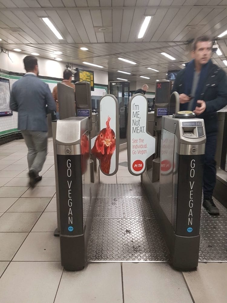 Clapham Common tube station is now fully plastered with more than 60 ads featuring cows, pigs and chickens. They appear on every poster, door and turnstile, telling commuters, ‘I’m ME, Not MEAT. See the Individual – Go Vegan’.